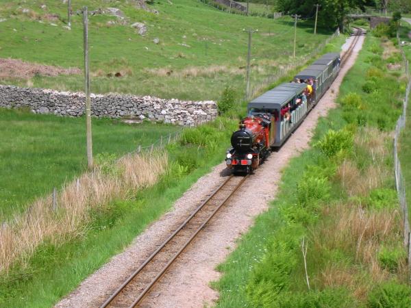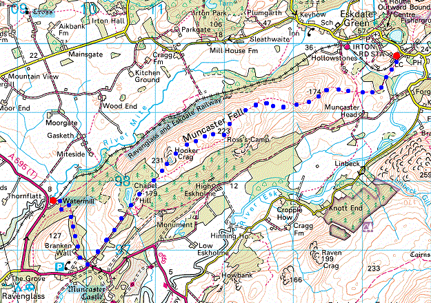Route: Eskdale Green Station - train ride on the Ravenglass and Eskdale Railway - Muncaster Mill Station - Fell Lane - Muncaster Tarn - Muncaster Fell (Hooker Crag) - Ross's Camp - Eskdale Green Station