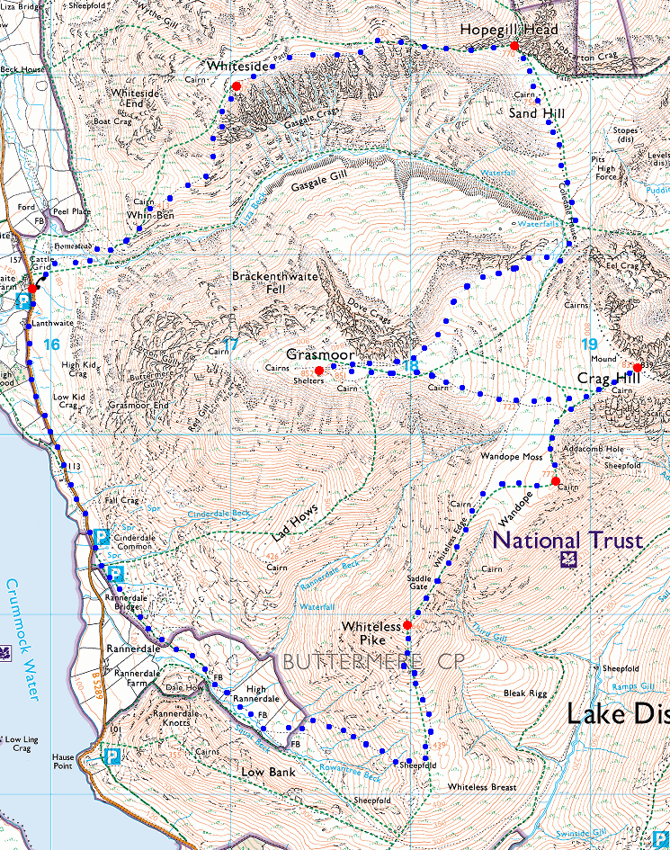 Route: Lanthwaite Green - Whin Ben - Whiteside - Hopegill Head - Sand Hill - Coledale Hause - Grasmoor - Eel Crag (Crag Hill) - Wandope - Thirdgill Head Man - Whiteless Edge - Saddle Gate - Whiteless Pike - High Rannerdale - Cinderdale Common - road - Lanthwaite Green