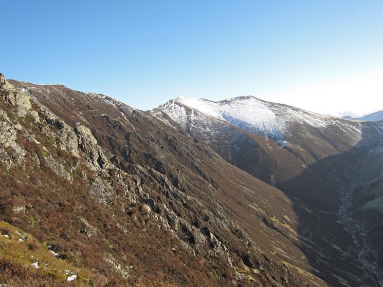Gasgale Crags, Gasgale Gill far below and snow on Hopegill Head and Sand Hill