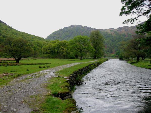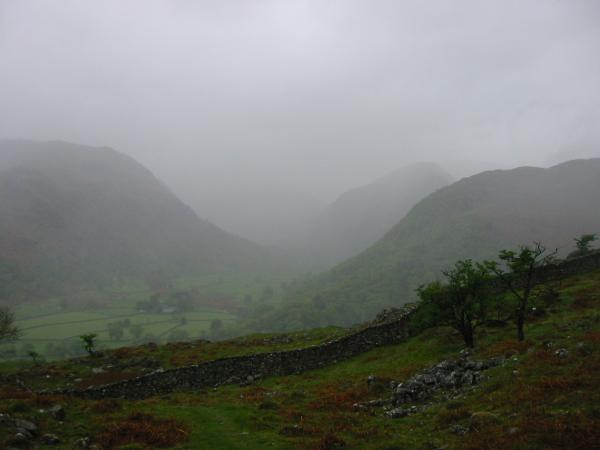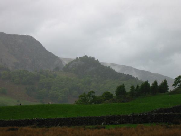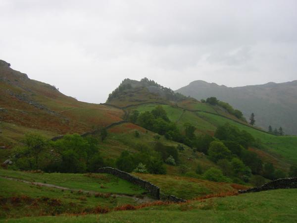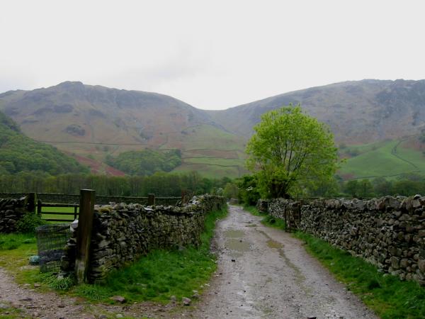 The track out of Rosthwaite. High Scawdel on the left and High Spy on the right