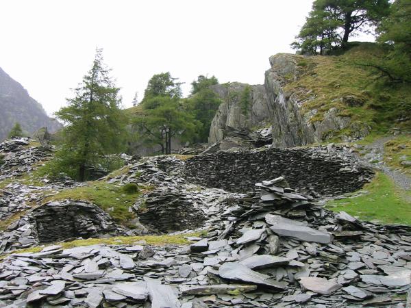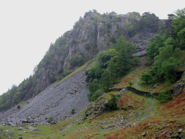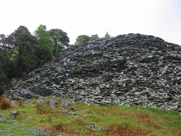 Anne on the left in a slate coloured jacket ascending the spoil heap near the top of Castle Crag