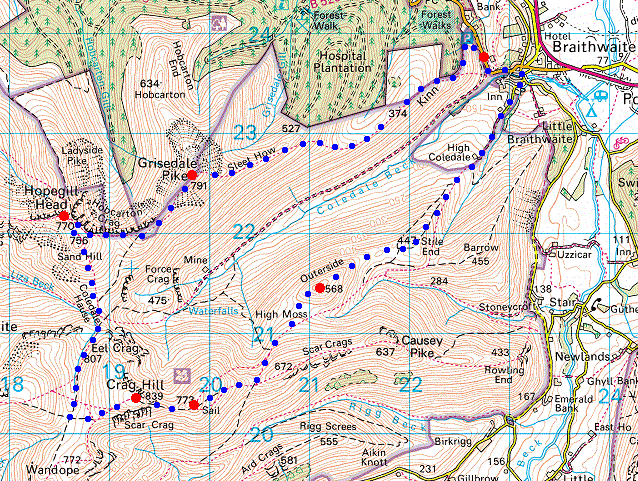 Route: Braithwaite - Kinn - Sleet How - Grisedale Pike - Hopegill Head - Sand Hill - Coledale Hause - Eel Crag (Crag Hill) - Sail - Sail Pass - Outerside - Stile End - High Coledale - Braithwaite