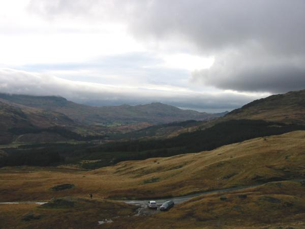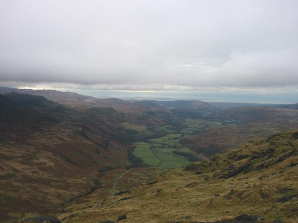 The view south from just above Hard Knott Pass down the Duddon Valley with Caw in the distance