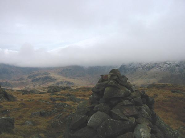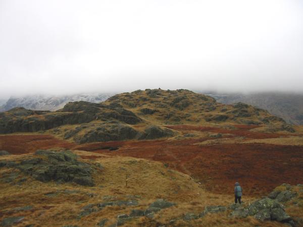 Heading to Hard Knott summit. The cloud hides the snow on Crinkle Crags