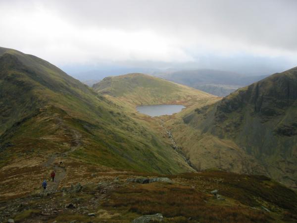 Looking down on Seat Sandal and Grisedale Tarn from the climb up from Deepdale Hause. Cofa Pike can be seen on the far left