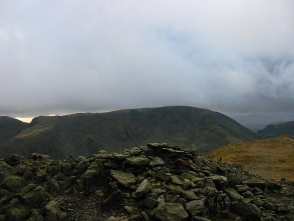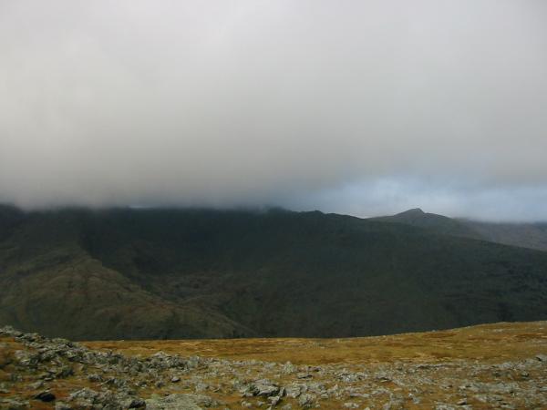 Helvellyn is lost in cloud. The pointed peak is Catstycam