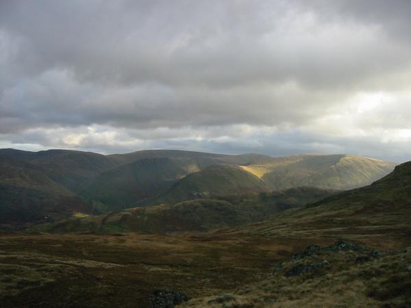 The Ill Bell ridge, Red Screes, Dove Crag, Hart Crag, the mass of Fairfield and Seat Sandal from Saint Sunday Crag