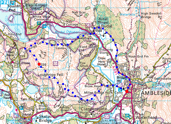Route: Ambleside - Rothay Park - Miller Bridge - Lily Tarn - Loughrigg Fell - Loughrigg Terrace - Loughrigg Cave - Rydal Water - Rydal - Rydal Park - Ambleside