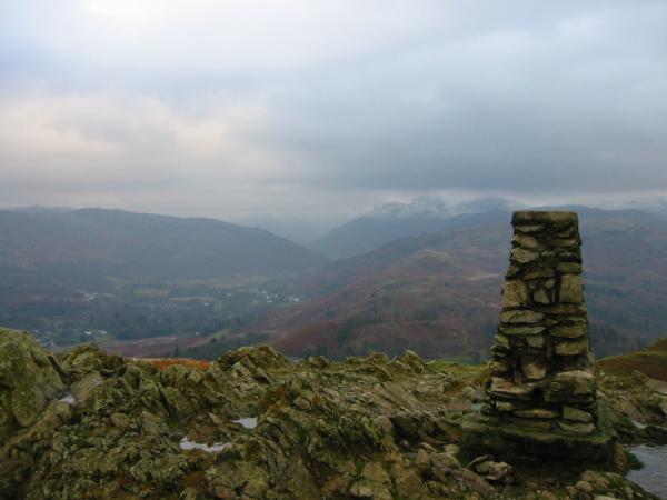 Snowy Langdale Pikes from Loughrigg Fell summit