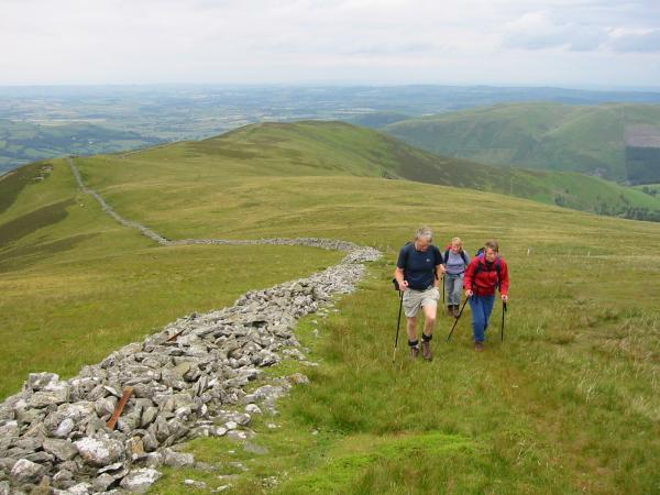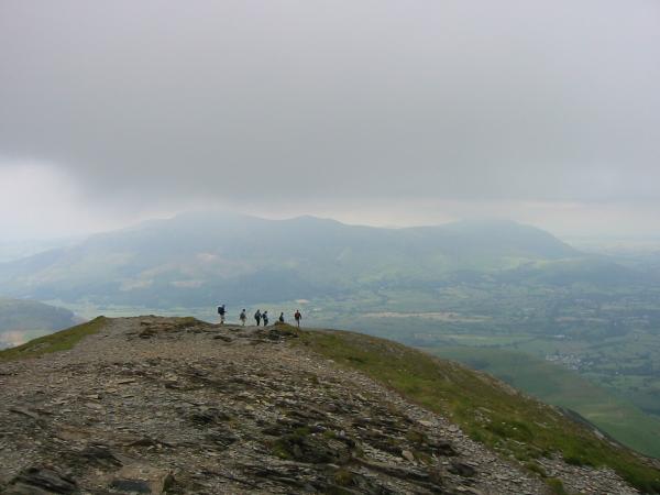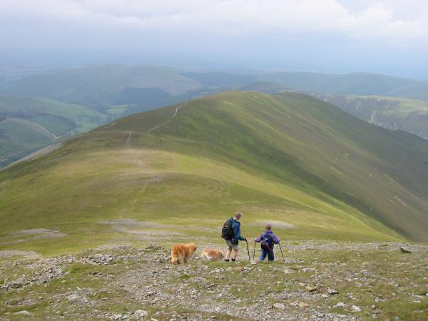 Walkers heading for Grisedale Pike's east ridge, with the cloud building over Skiddaw and Blencathra