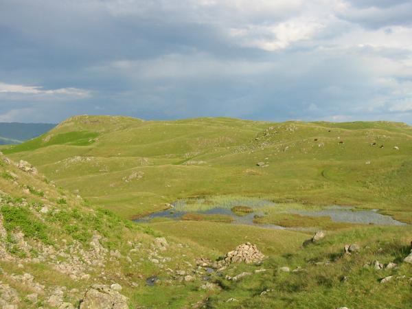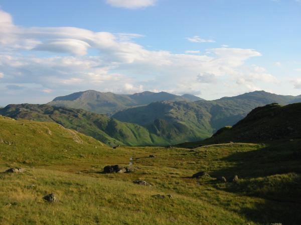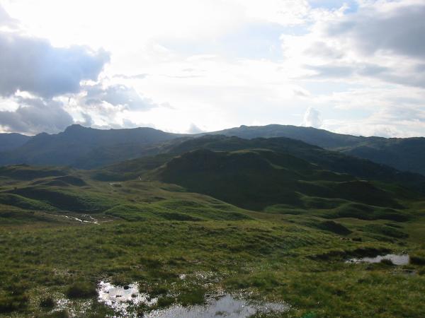 Lingmoor Fell, Side Pike and Pike O' Blisco with the Coniston Fells behind from the ridge between Silver How and Blea Rigg