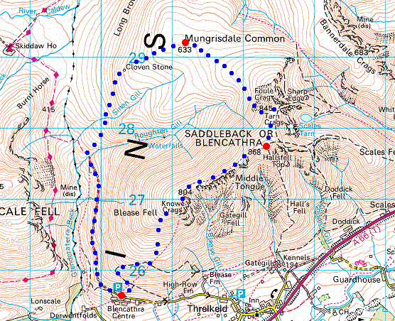Route: Blencathra Centre, Threlkeld - Blease Fell - Knowe Crags - Gategill Fell Top - Blencathra - Atkinson Pike - Mungrisdale Common - Glenderterra - Blencathra Centre
