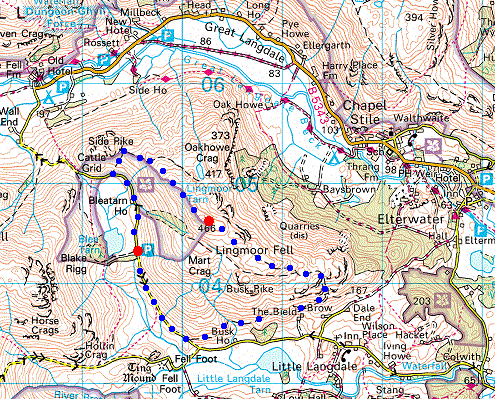 Route: Blea Tarn carpark - Blea Tarn - Side Gates - above the intake wall, Little Langdale - east ridge - Lingmoor Fell - northwest ridge - col with Side Pike - road - Bleatarn House - Blea Tarn carpark