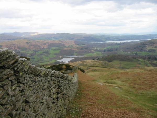 Looking down Lingmoor Fell's east ridge to Elter Water and Windermere